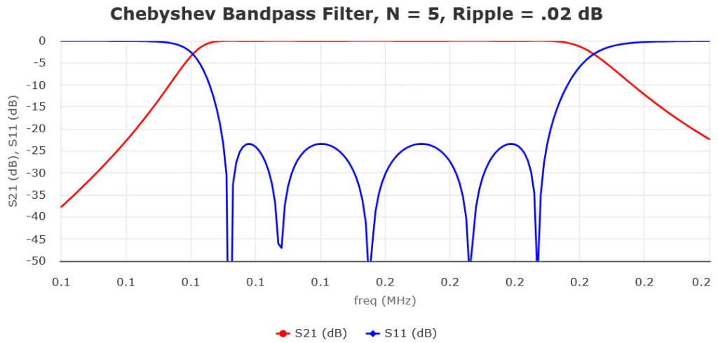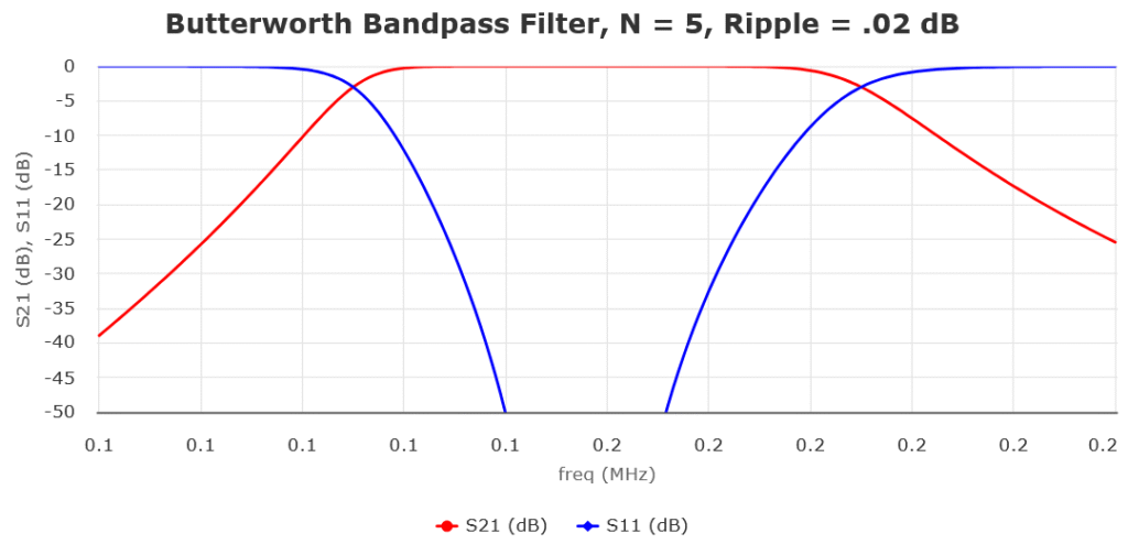 - The two Coupling Capacitors between the three transformers couple the stages and also set the bandwidth of the circuit – how wide the bandpass is. The aim is to have the lowest overall loss, while also having a wide enough – but not too wide bandwidth. The larger the capacitance the wider the bandwidth, but the loss lower overall loss. The lower the capacitance the sharper the skirts and narrower the bandwidth, which is good, but then loss will be higher. The aim again is to cover the particular band (Say 14.000 to 14.350MHz for 20 Meters) with a relatively flat top, and to see a sharp roll-off as the signal gets out of band, while filtering out as much out-of-band interference as possible (see below).
